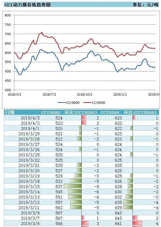 4月3日中國煤炭資源網(wǎng)最新一期的CCI動力煤價格顯示,CCI5500動力煤價格報623元/噸,較上期價格上調(diào)1元/噸,較上月同期價格下調(diào)10元/噸或1.6%;CCI5000動力煤價格報524元/噸,較上期價格上調(diào)2元/噸,較上月同期水平下調(diào)36元/噸或6.4%。